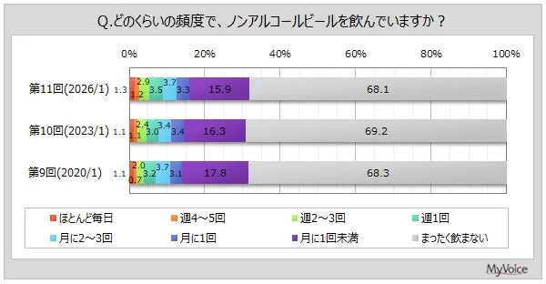調査によると、ノンアルコールビールを飲んでいる人は全体の3割強なんだ。その中で、週に1回以上飲んでいる人は約9%だそう。特に男性の20〜30代や女性の20代で、飲む頻度が高い傾向が見られるよ。