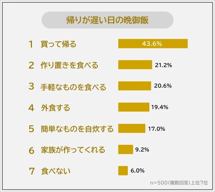 さて、本題!みんな、遅くなった日の晩御飯、結局どうしてるんだろうね?調査結果はこんな感じだったよ。