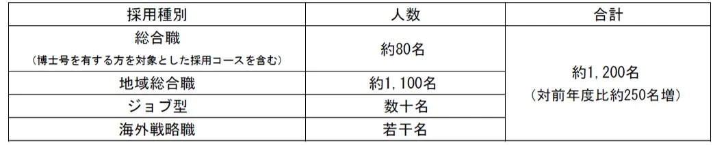 全体で約1,200名の採用を予定しているんだって。これは前年度に比べて約250名も増えているんだ。いろんな職種があるから、あなたの興味に合うものが見つかるかも。